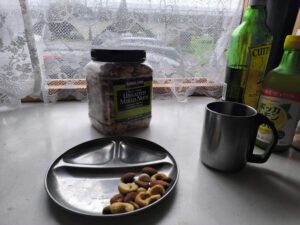 コストコのナッツをつまみにチビチビと飲り始めます。