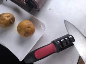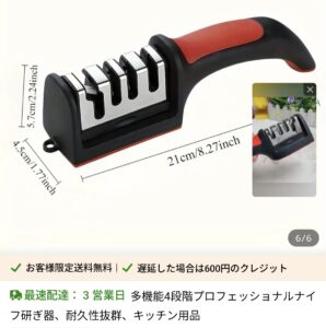 3. その包丁研ぎも同じく値段合わせで購入しました。「同じ方向に研ぐように」との注意書きはありましたが、手前に引くのか、奥に押すのか?どちらの方向なのかわからないまま使用しましたが、そこそこ研げるようにはなりました。しかし刺身包丁などの鋼のものは細かく欠けてしまいました。日本刀も研げないと思うので、パワハラ社長は注意してください。
