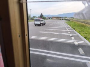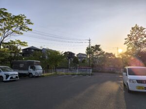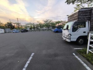 おそらく向こうの相模ナンバーの青い車は窓に目隠しをして寝ていたので車中泊ではないかと思います。