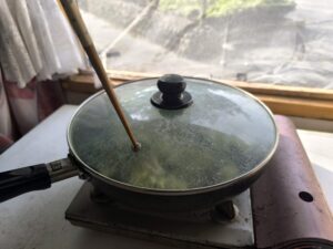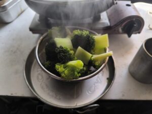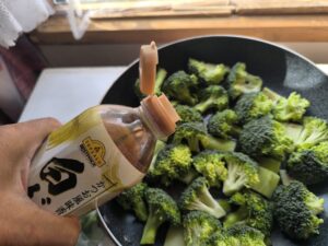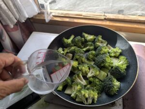 ブロッコリーを切り分けてフライパンに入れて100㏄の水を入れ、