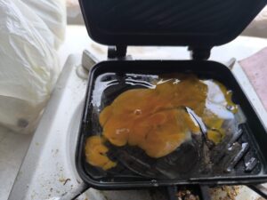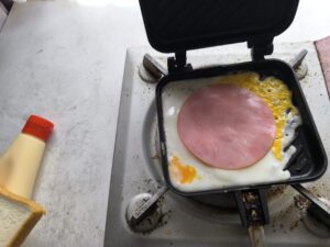 ホットサンドメーカーにサラダオイルを引いてタマゴを落とし