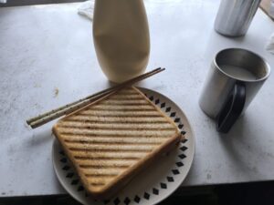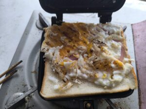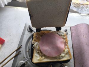 パンを挟んで焼いて最後にマヨネーズをたっぷり入れれば出来上がりです。
