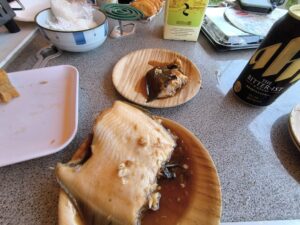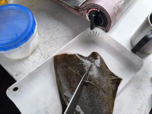 冷蔵庫にしまってあったクロガシラ(カレイ)を取り出し水洗いして背中に包丁を入れます。