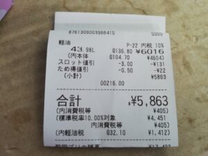 支出:5,863円(軽油)+1,345円(スーパー)+500円(キャンプ場)=7,708円