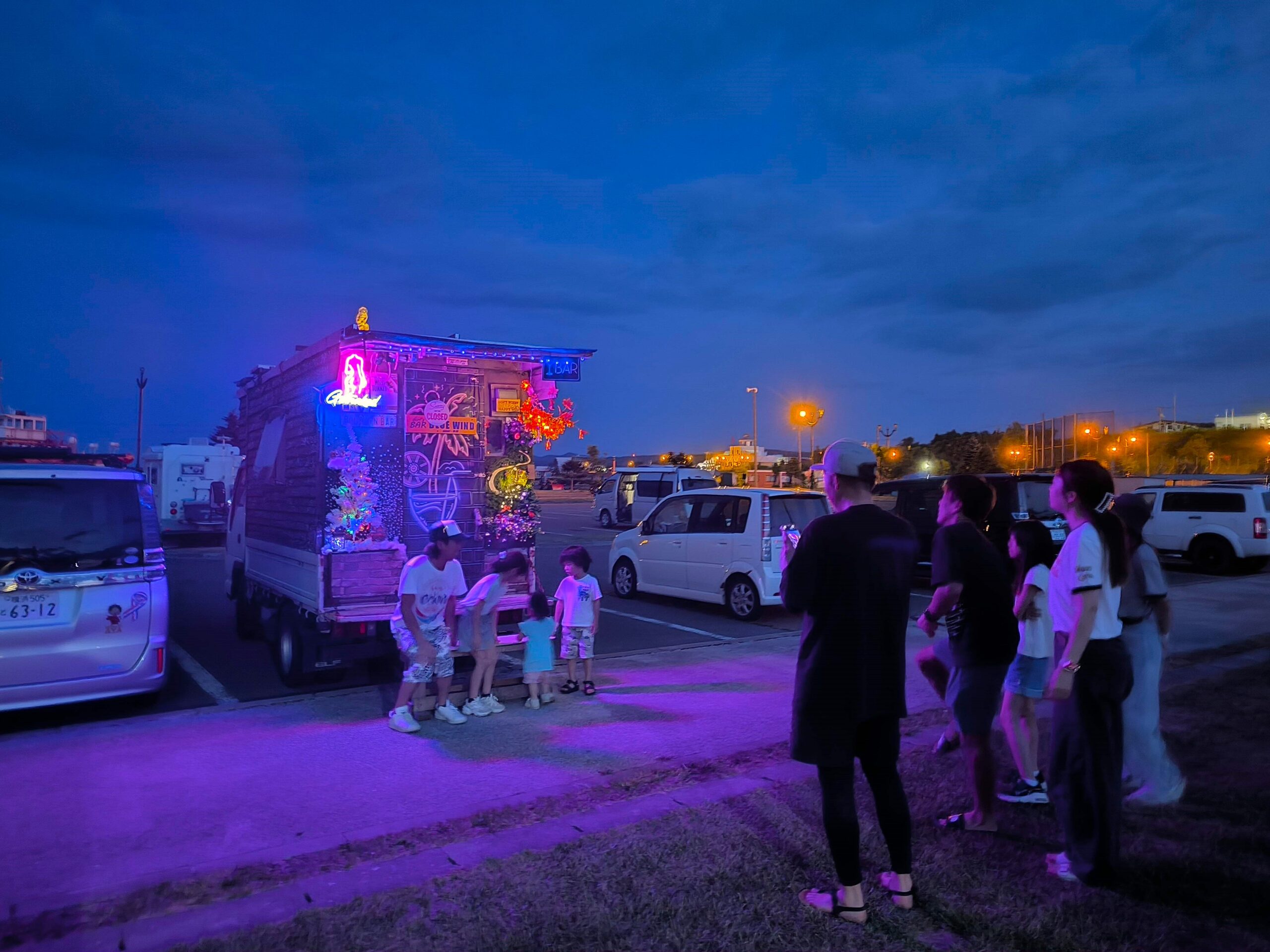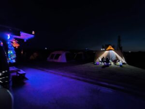 そして、青にイルミネーションが灯ると、隣のテントのファミリーが集まってきました。