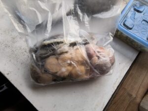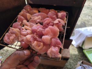昨夜ソミュール液に浸けておいた燻製の素材を冷蔵庫から出し、