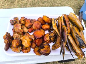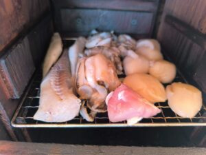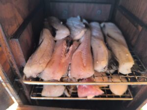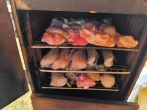 魚の場合、吊るして燻製にするか(僕の燻製器では高さがないから難しい)、よく乾かして干物に近い状態にしてから燻製するのがいいようです。