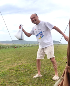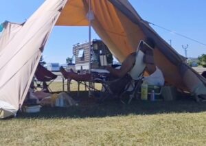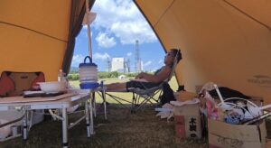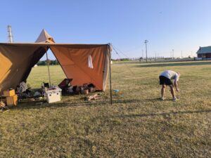 いえ、昨日の夜寝る時に畳んだテントを広げているのです。