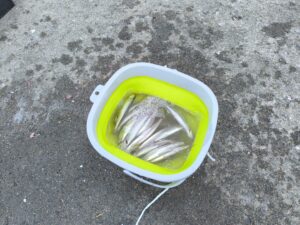 釣ったチカの(←正確には釣ってません)頭と内臓を取り、塩水に浸けておきます。