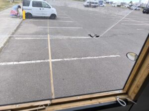 今日は風が駐車スペース側から吹いてくるので、いつもと逆の入り口を開けていて駐車場側が見えません。
