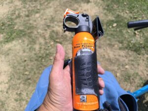 熊撃退スプレーを持ち、