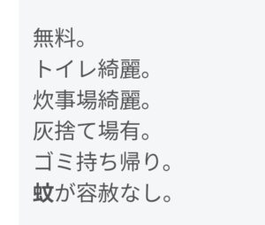 ここは無料のキャンプ場なのですが、いままでテントを張ったことがありません。