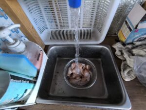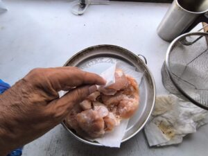 昨日の夕方、ソミュール液に浸けておいた鶏ももを軽く水で流し、