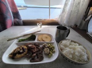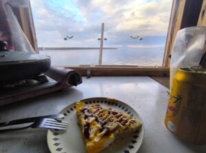 暮れなずむ知床半島を眺めながらお好み焼きです。