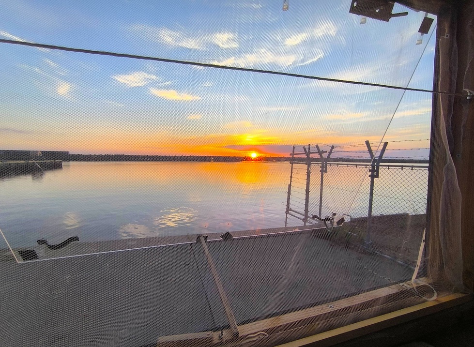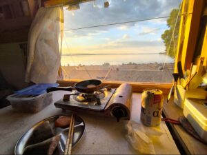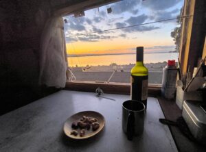 網走湖に落ちていく夕陽が差し込む中、酒を飲みます。
