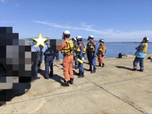 行ってみると、救急車から隊員が潜水服を着ながら下りてきます。