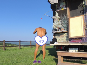 ぎゃはは、だめですよ、公共の場でケツ出しちゃ。