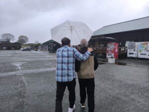 小雨の中、レストランの方にテクテクとみんなで歩いていきます。